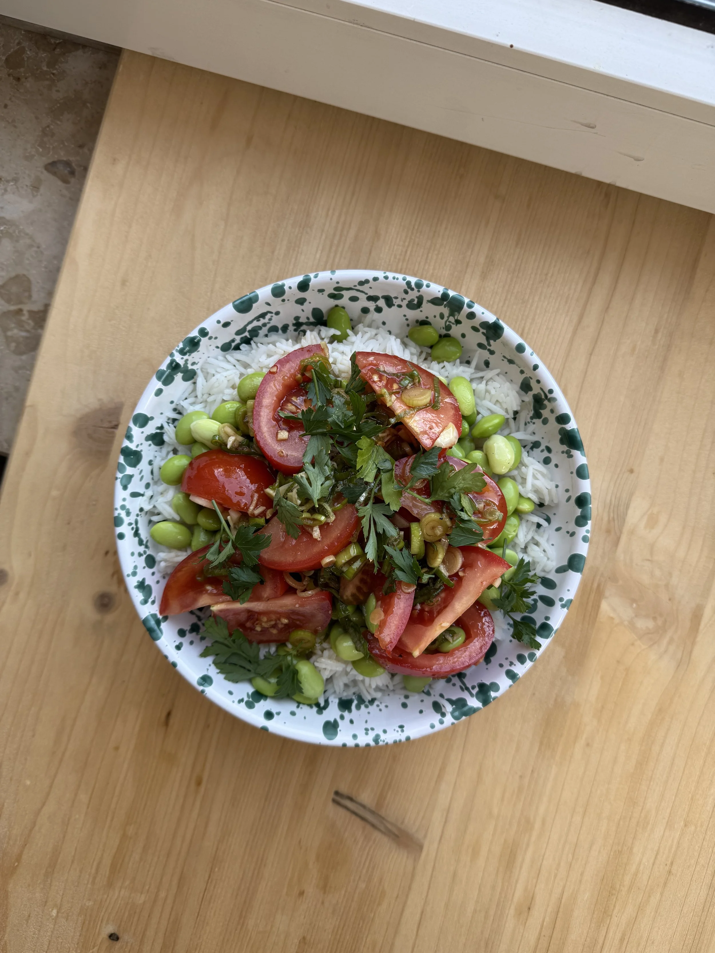 serve the tomato salad with pre-cooked rice, edamame and parsley. make sure to pour over the leftover marinade from the salad container.