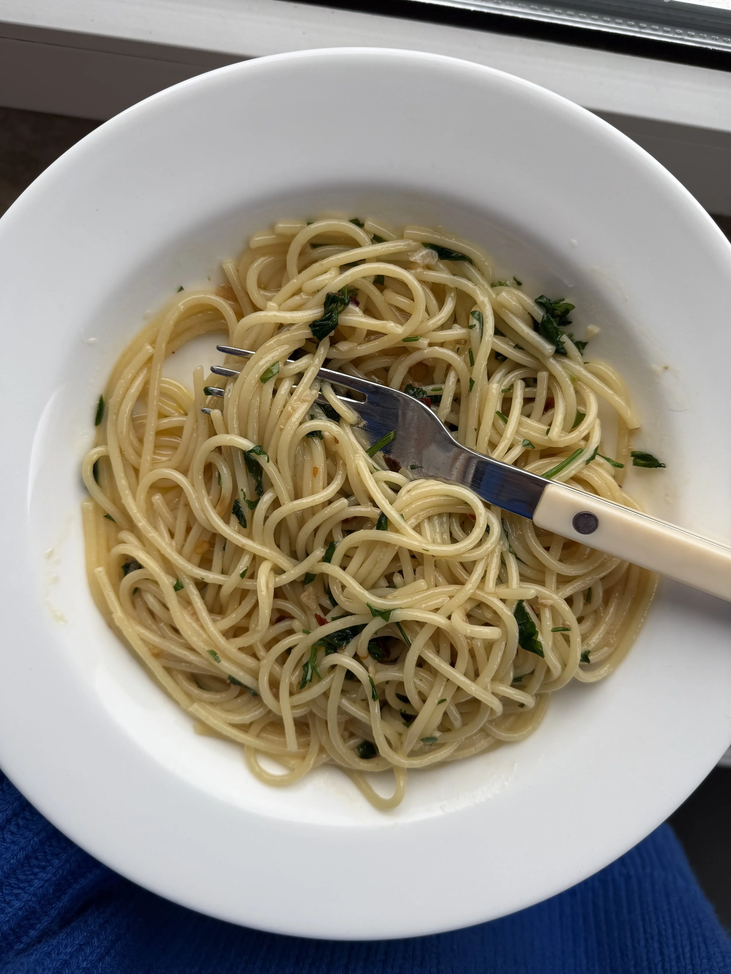 add a ladle of pasta water to the pan, along with the fresh parsley. finish cooking the pasta in the sauce. it will become emulsified and creamy.
