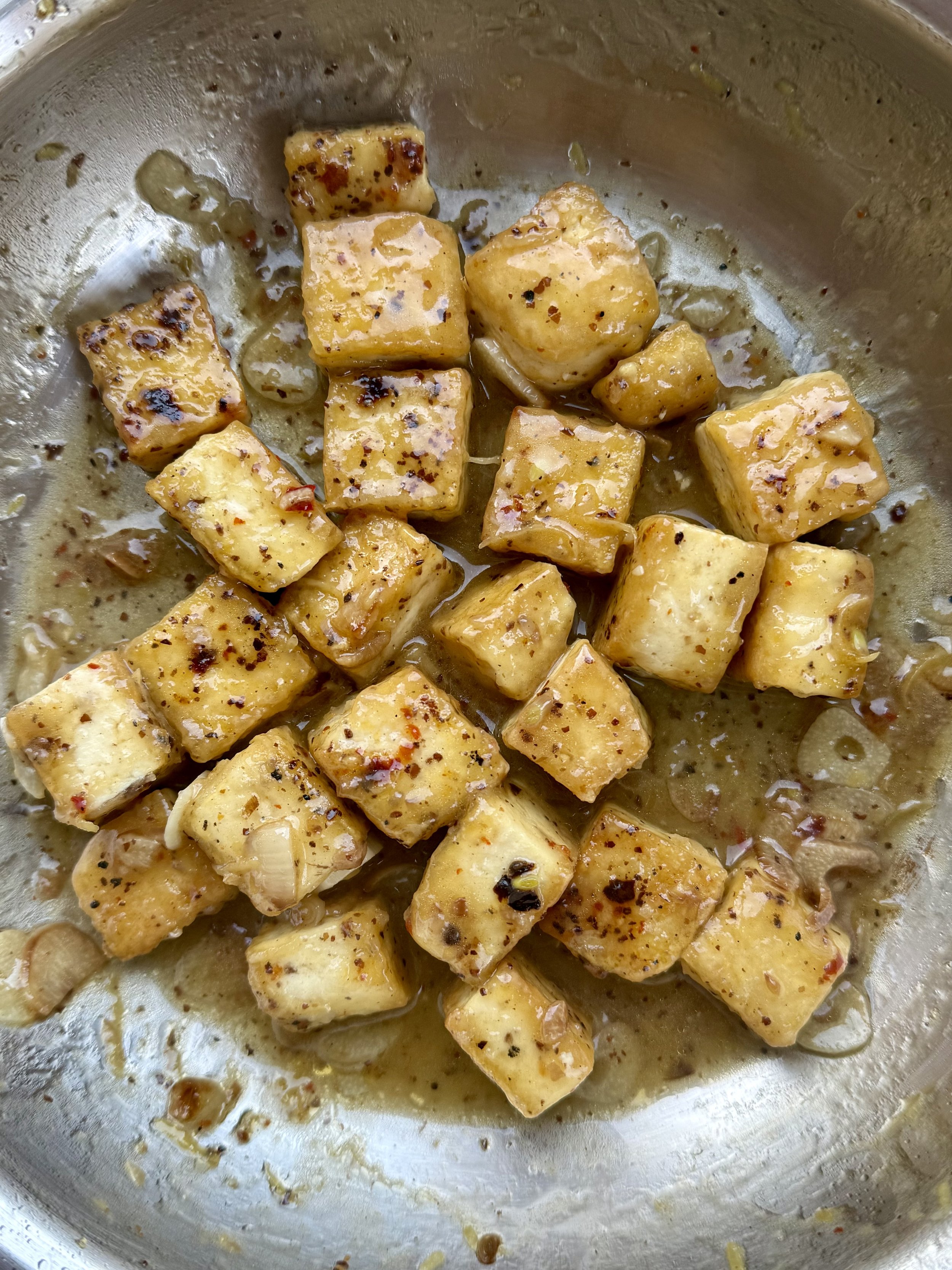 add the tofu and immediately shake the pan so the tofu cubes slide across the bottom. cook undisturbed for 3 minutes, turning down the heat if it gets too dark.